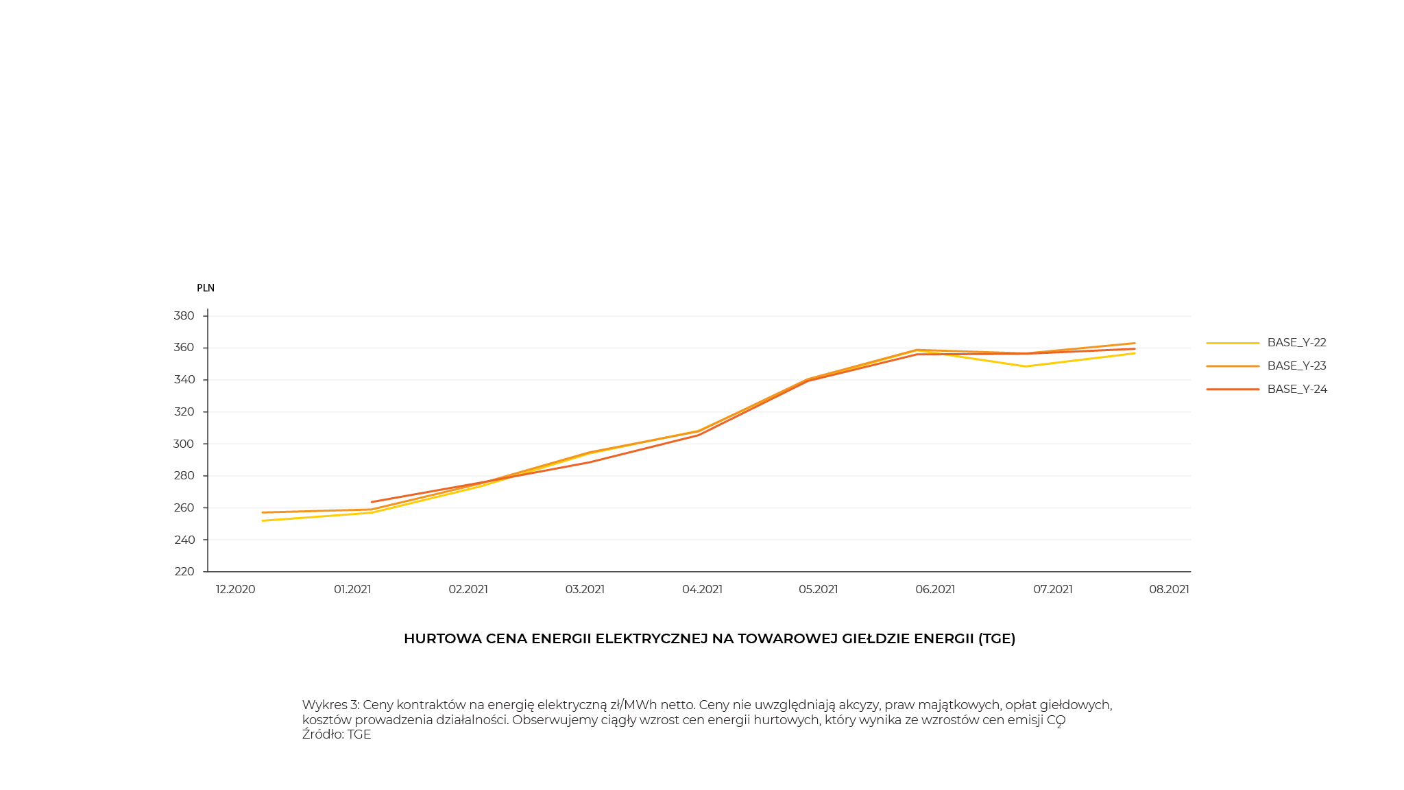 - Przyglądając się aktualnym notowaniom rocznych kontraktów na zakup energii elektrycznej z dostawą w roku 2022 na Towarowej Giełdzie Energii (TGE S.A.), widzimy, o ile więcej przedsiębiorcy i gospodarstwa domowe zapłacą w przyszłym roku za energię – stwierdza Prokop i odnosi się do wykresu (patrz ramka).