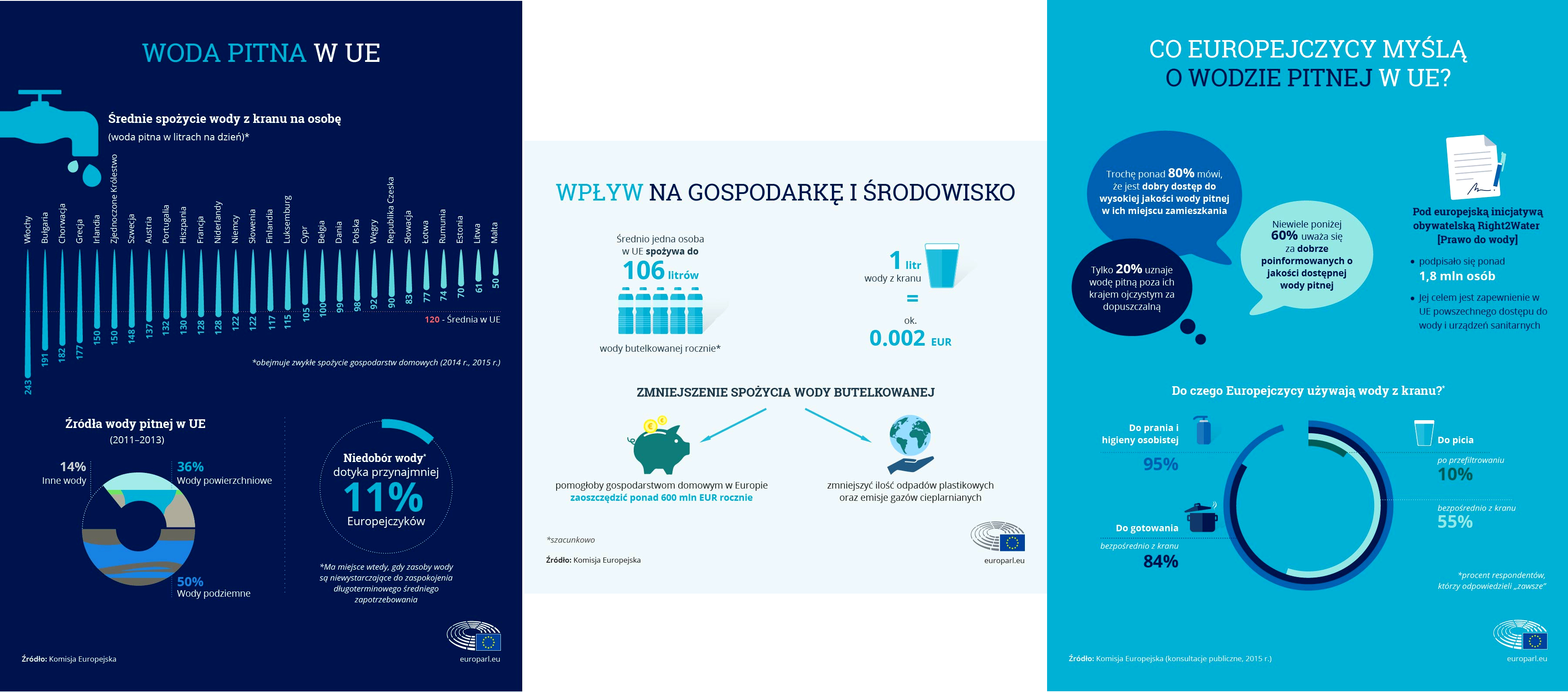 W dyrektywie UE w sprawie wody pitnej ustanowiono minimalne normy jakości wody przeznaczonej do spożycia przez ludzi (picia, gotowania, innych celów domowych) w celu ochrony przed zanieczyszczeniami. 18 lutego 2020 br., posłowie z parlamentarnej Komisji Ochrony Środowiska i Zdrowia Publicznego zagłosowali za wstępnym porozumieniem osiągniętym przez Parlament i Radę w grudniu 2019 r. w sprawie aktualizacji przepisów mających na celu zwiększanie zaufania konsumentów i zachęcanie ich do picia wody z kranu.